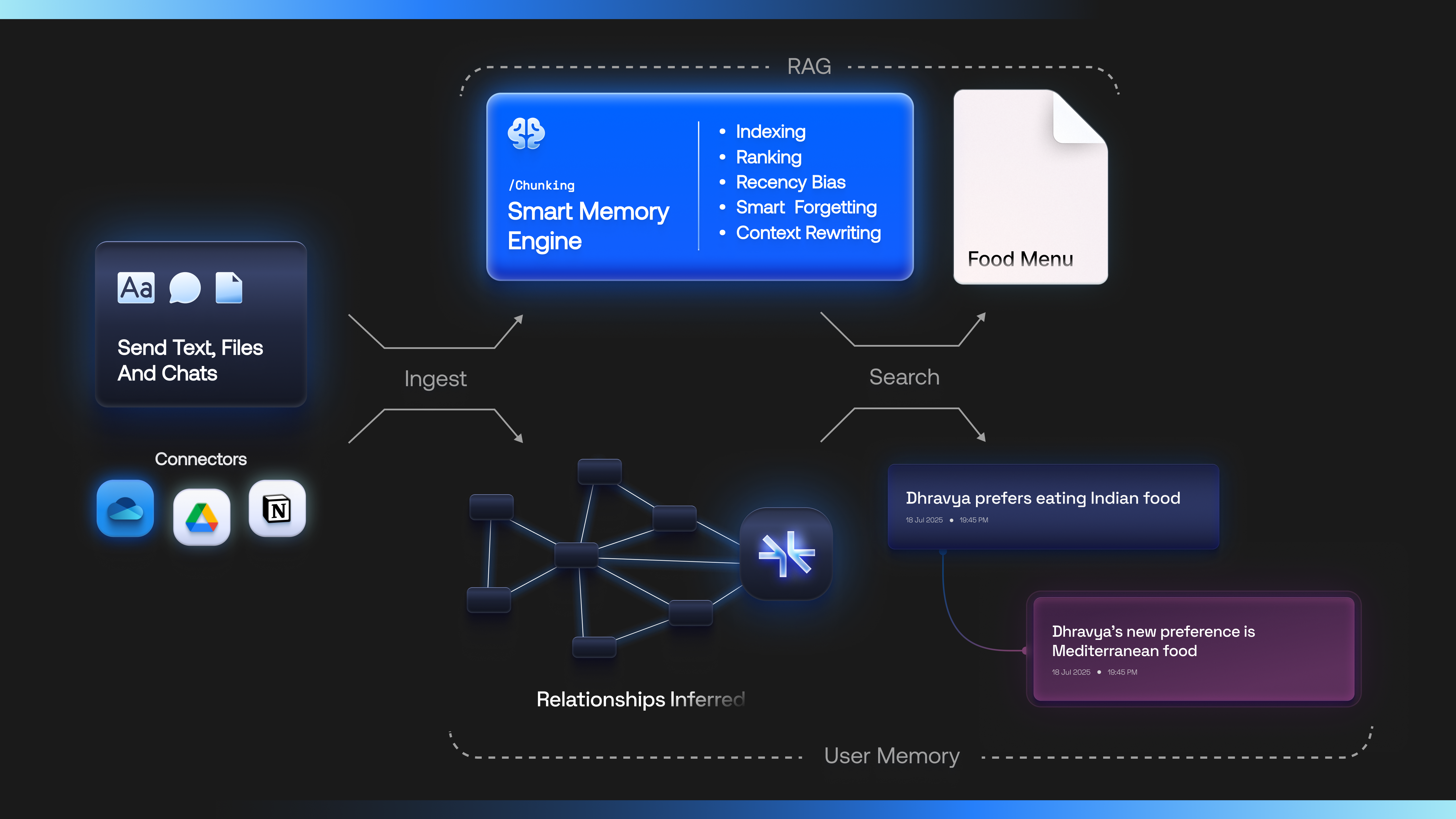 • Supermemory intelligently indexes them and builds a semantic understanding graph on top of an entity (e.g., a user, a document, a project, an organization).