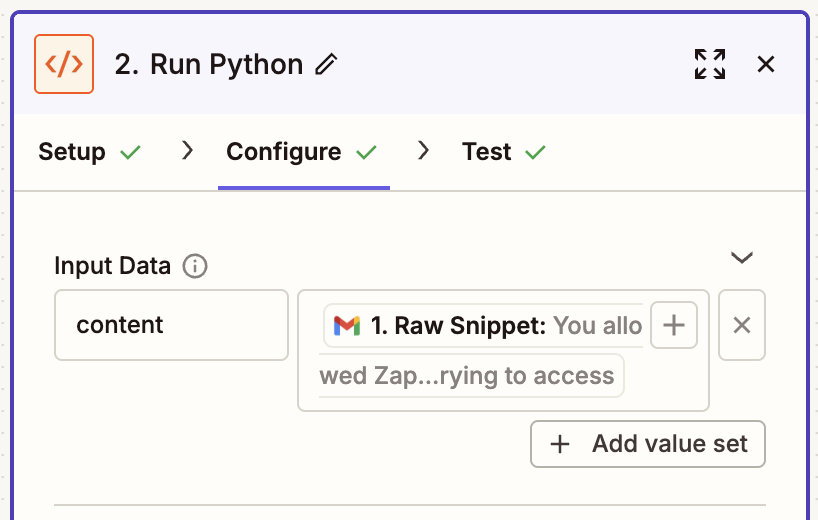 Now, add a new ‘Code by Zapier’ block. Set it up to run Python.In the Input Data section, map the content field to the Gmail raw snippet.
